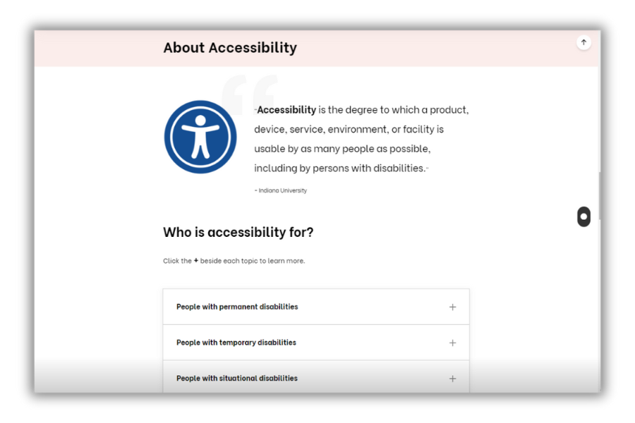 One microcourse introduces disability and accessibility, relating them to the denomination’s core teachings and values. Each of the other four microcourse gives an overview of one category of accommodations, who it supports, and the basics of implementation with visual examples. At the end of each microcourse, learners find links to resources for further learning and a short knowledge check.